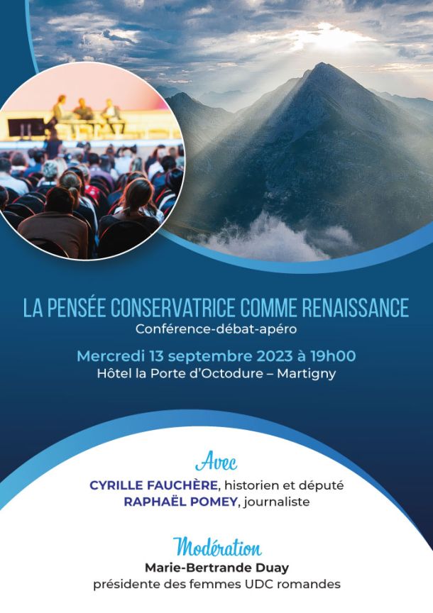 Deux invités d'honneur, Cyrille Fauchère et Raphaël Pomey, débatteront après avoir chacun exposé leurs idées. Dans sa conférence, Cyrille Fauchère démontrera que les partisans de la déconstruction – économique, sociale, culturelle, identitaire, etc. – profitent d’un certain vide laissé par le débat parlementaire. Or les principes qui devraient régir l’action d’un élu sont ceux de la conviction, de la saine critique et de la force de proposition, tout en s’appuyant sur des valeurs assumées. Quant à lui, Raphaël Pomey s'attachera aux causes de la disparition de la pensée conservatrice dans le paysage médiatique. La faute à la gauche, uniquement ? Loin de là ! Des pistes de reconquêtes d'un précieux héritage intellectuel seront aussi proposées.